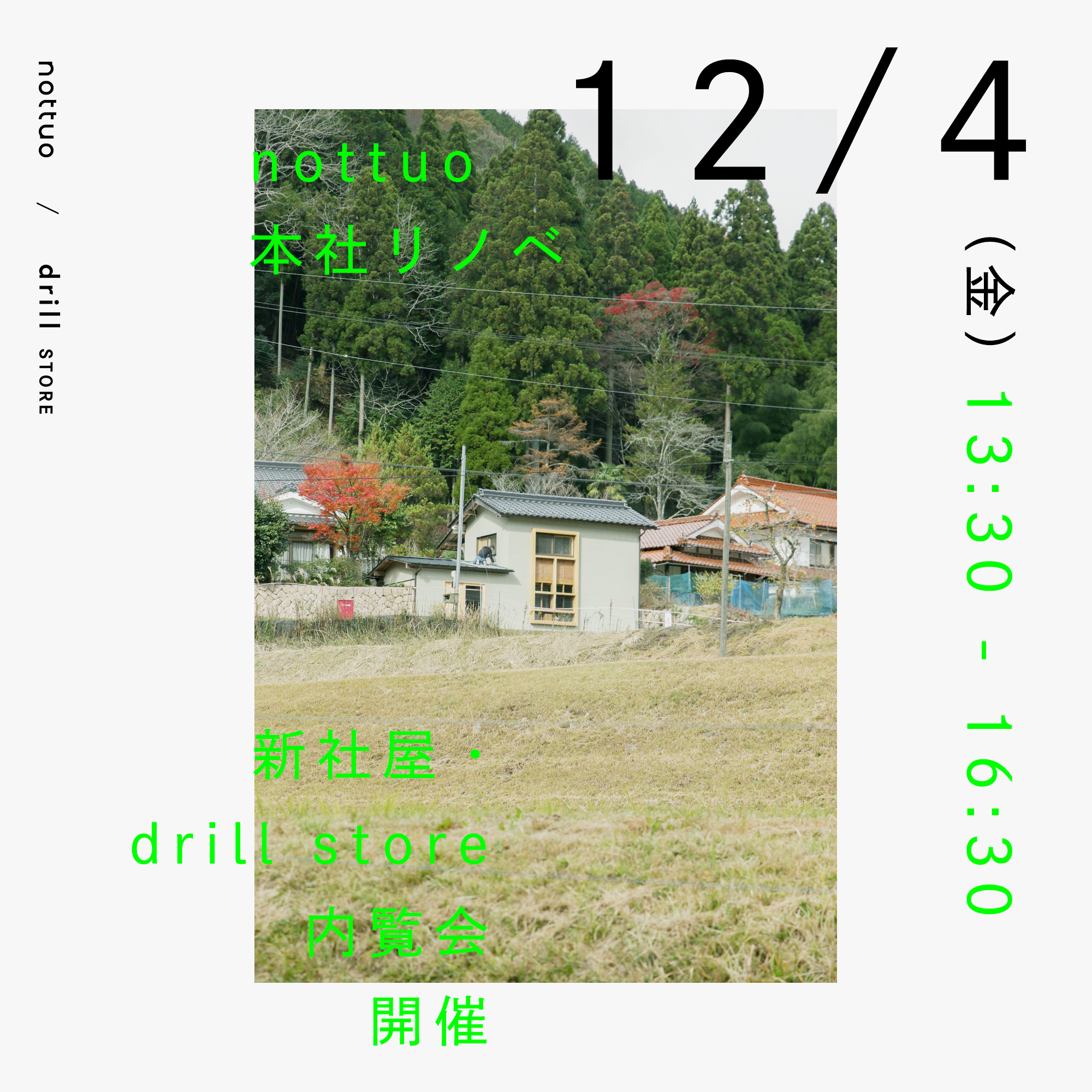 岡山・東京の二拠点で活動するブランディングデザインファームのnottuo株式会社(ノッツオ株式会社 / 本社:岡山県西粟倉村、代表取締役:鈴木宏平)は、2020年12月5日(土)の新社屋&フラッグシップストア「drill store」のオープンに伴い、2020年12月4日(金)に内覧会を開催いたします。