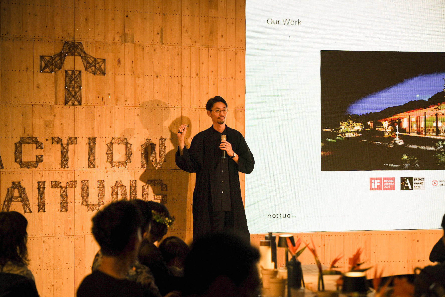 今回の授賞式には日本から我々nottuo/点々の取り組みと、佐賀でゼロカーボンエミッションに取り組むSAGA COLLECTIVE の取り組みを紹介され、特設ステージを舞台に各1時間の通訳を入れたプレゼンテーションさせてもらった。