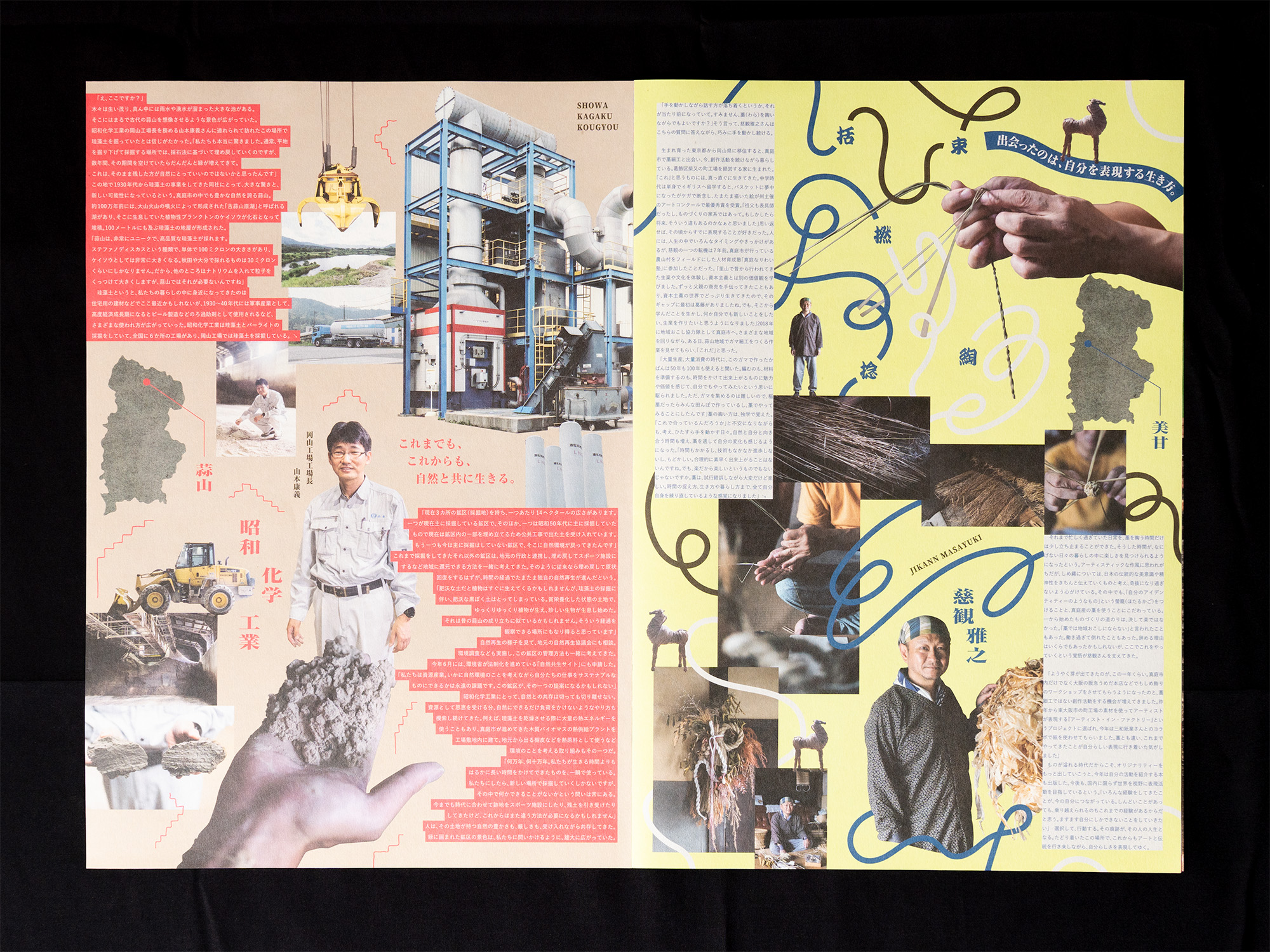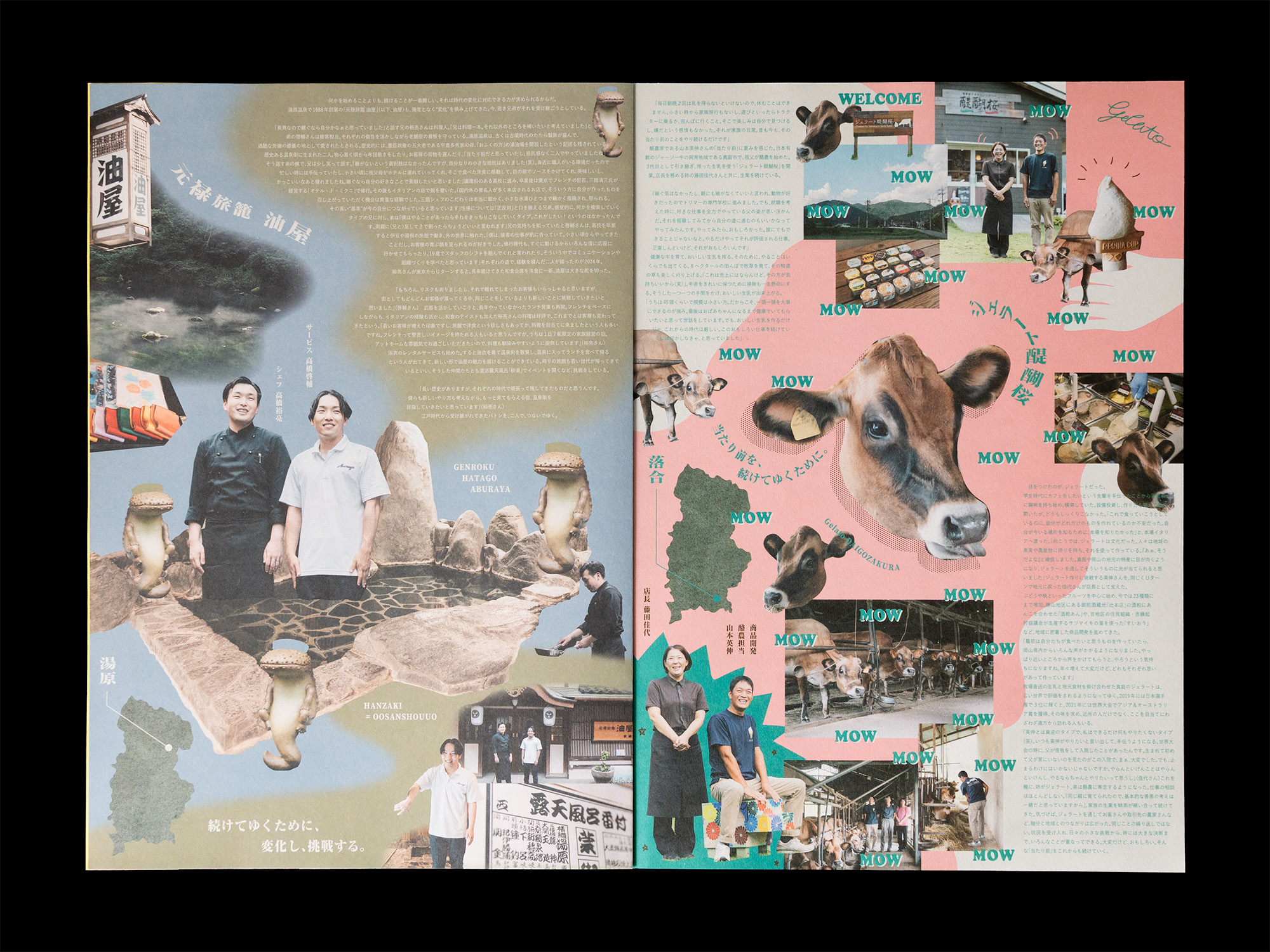 真庭という豊かな土地を舞台に、それぞれの事業者さんが誇りを持って事業や自分自身と向き合う姿のかっこよさ、面白さ、想いと物語を、全ての記事ページの色構成やデザインを変えて表現しました。表紙に大きくあしらった大胆で楽しげなタイトルのホログラム箔も、事業や取り組みを固く捉えず面白さを感じてもらうためのこだわり。
