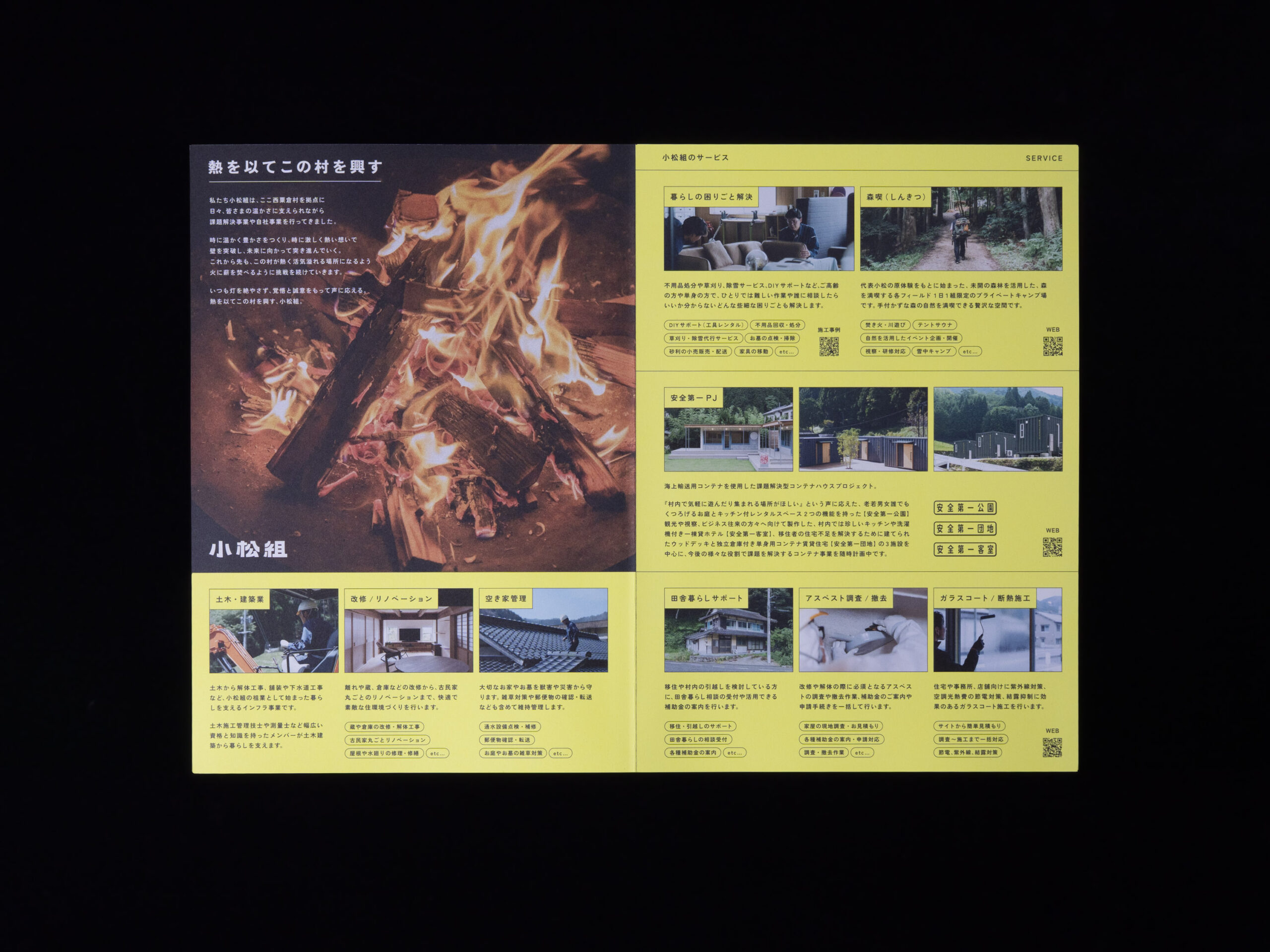 そうして生まれたのが「熱を以てこの村を興す」というパーパスの言葉。この言葉に沿ってブランドカラー設計を見直し、ロゴやツールに展開しています。ブランドカラーは、工事現場の警告色をベースに、エネルギー溢れるイエローを設定し、ロゴは力強く真っ直ぐで挑戦的な姿勢を書体に落とし込みました。一般的にたタブーとされるロゴを見切れさせる使い方も、土建屋という枠に捉われないかっこよさや常に行動を続ける熱量を表現するために、敢えてルールとして取り入れています。