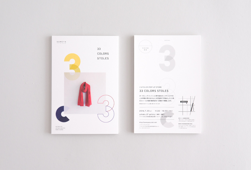 Work ソメヤスズキ-ストール展DM GRAPHIC 2016.07.15 card オーガニックコットンと草木染めのラボ『ソメヤスズキ』のストール展用DMデザイン 新色含め開発された33色のストールが並びます。 DESIGNER:鈴木 宏平 / nottuo