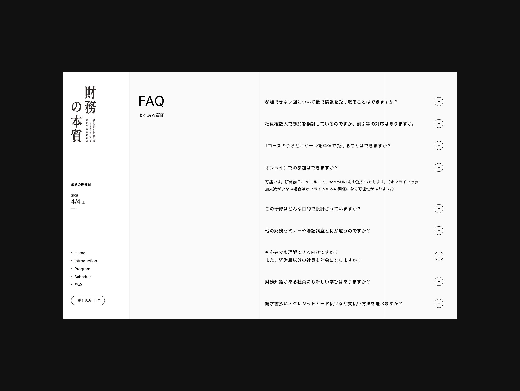 内容の異なる2つの研修を連続した学びとして捉え、レイアウトの基礎構造を共通化。両サイトの体験に一貫性を持たせました。デザイントーンとしては、それぞれの研修が持つ信頼感と緊張感を損なわない、静かで芯のあるトーンを意識。過度な装飾は避け、余白と文字組によって、読む人が落ち着いて読み進められる閲覧体験を設計。