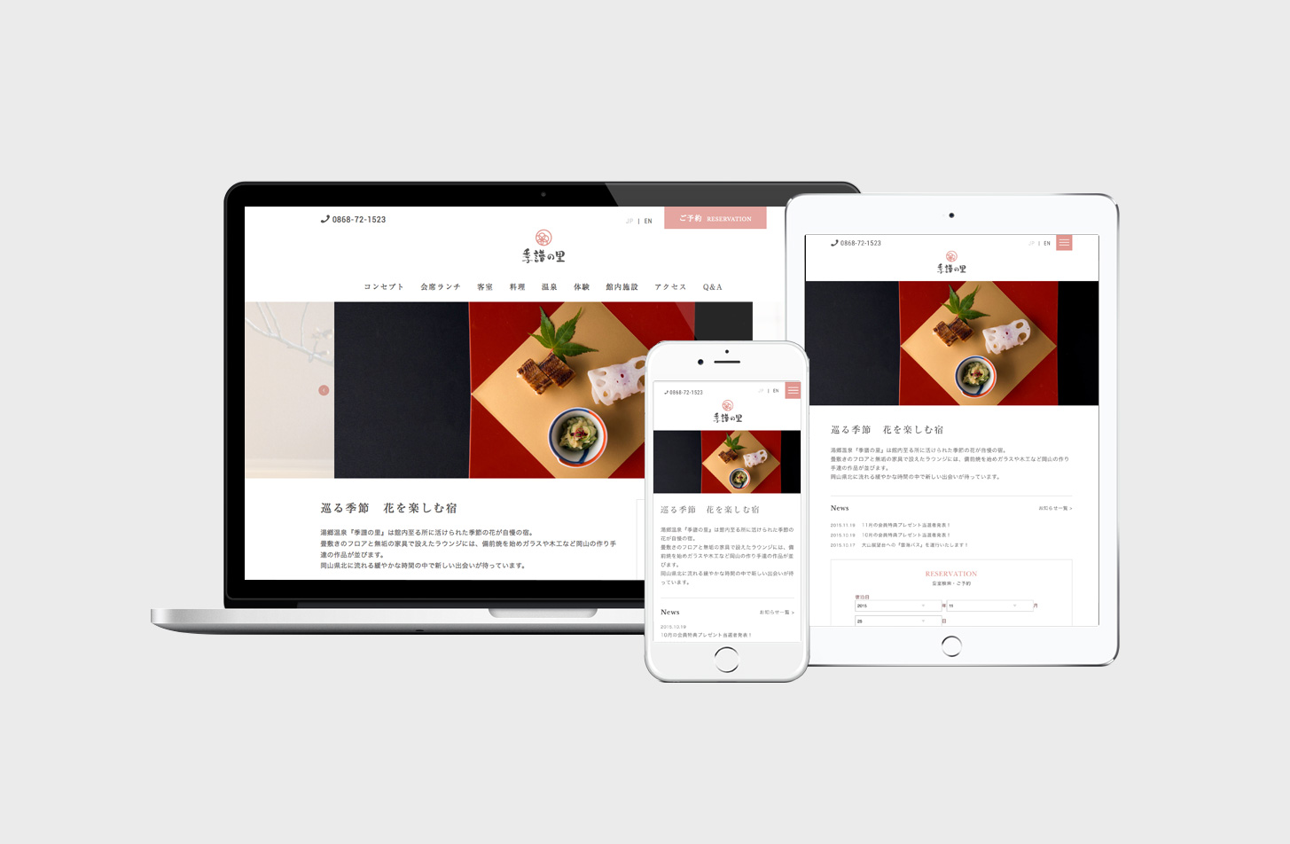 継続的に関わらせていただいている湯郷温泉旅館『季譜の里』さんのオフィシャルwebサイトをスマホ・タブレット・PCに対応したレスポンシブサイトへとフルリニューアル。
